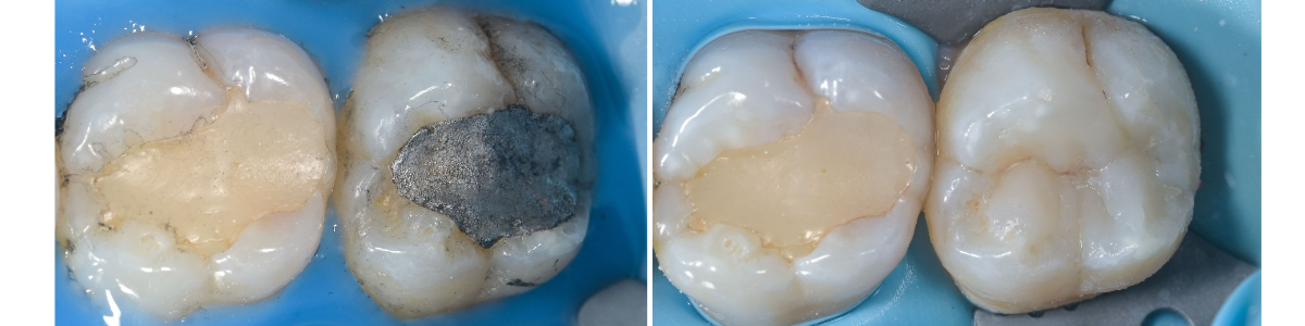 İlk fotoğraftaki amalgam dolguyu yenileyerek kompozit dolgu yaptık. Sağdaki fotoğrafın sağında dişle bağlantısı bozulmuş eski bir kompozit dolguyla solda bizim yaptığımız kompozit dolgunun farkını görebilirsiniz.