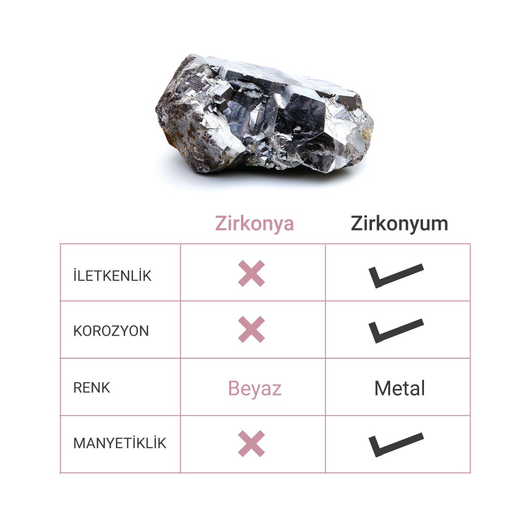 Bizim implantlarda ya da kaplamalarda kullandığımız ve dilimize maalesef “zirkonyum” olarak yerleşen malzeme aslında “zirkonya”dır. Zirkonya dediğimiz madde, zirkonyumun oksit kristalidir (ZrO2) ve metal değildir. Zirkonyumla fiziksel özellikleri çok farklıdır. Zirkonya ısı ve elektriği iletmez, korozyona uğramaz, beyaz renktedir, serttir, manyetik değildir.